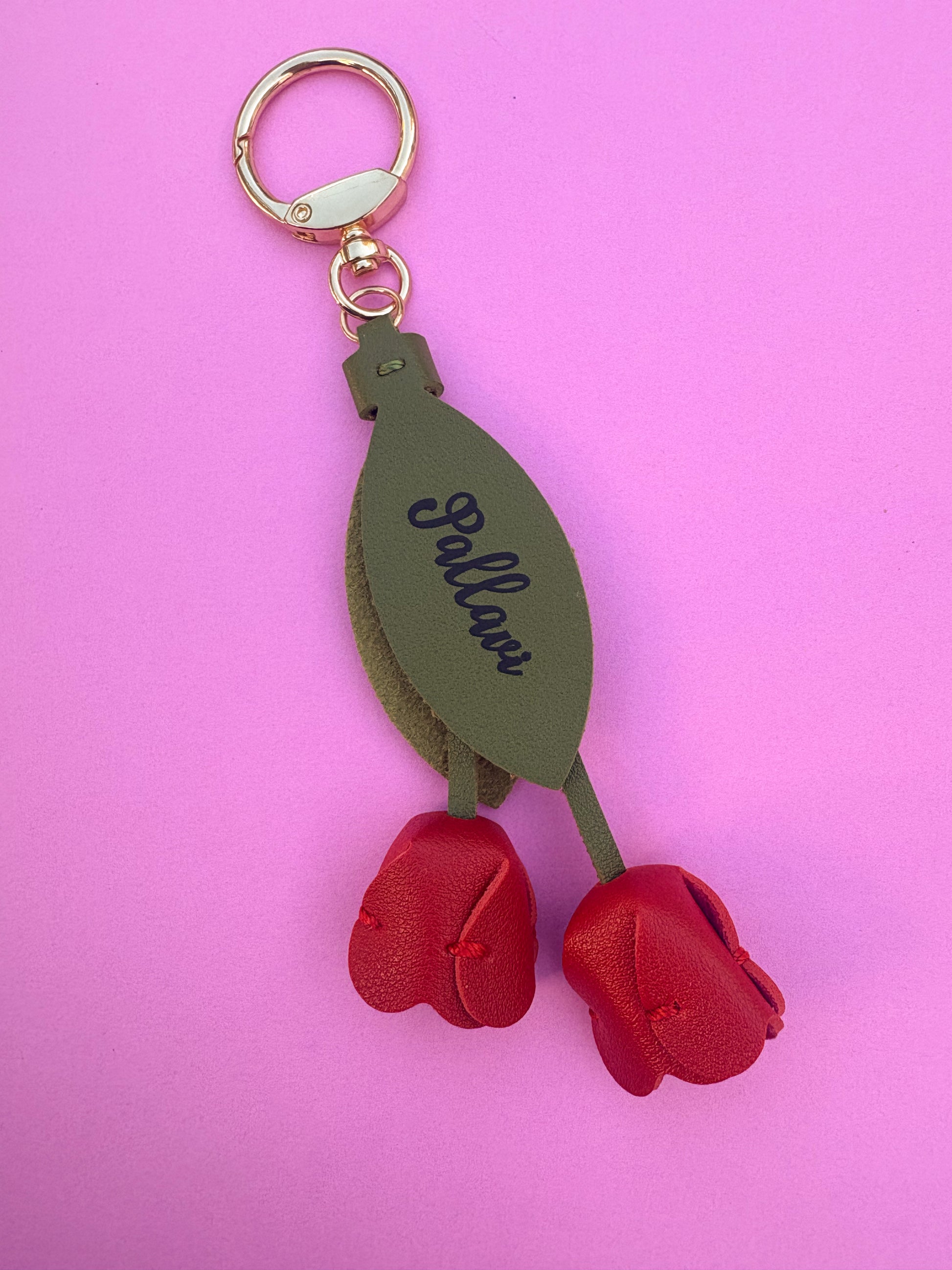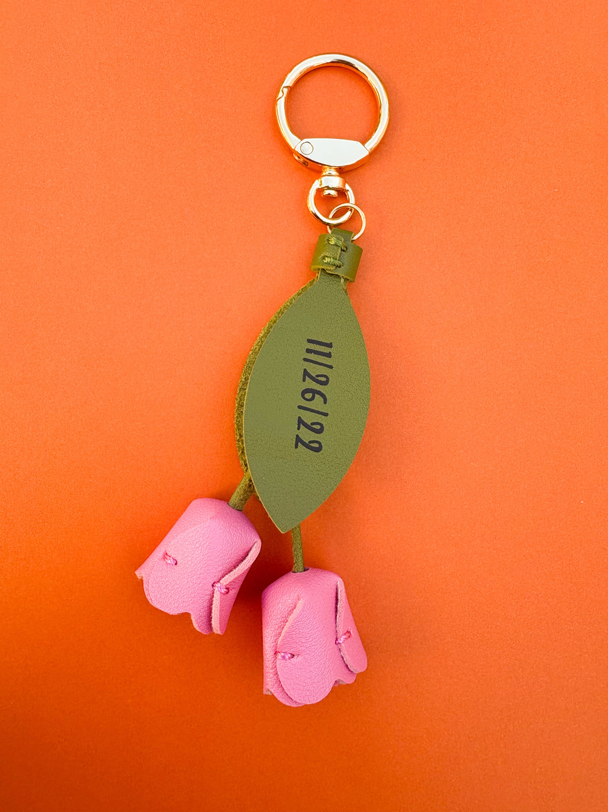 Add a pop of style and personality to any accessory with our handcrafted Tulip Style Bag Charm. Made from high-quality vegan leather, this chic pendant is perfect for your handbag, backpack, suitcase, or keys. Plus, it can be personalized with a name or initials for an extra special touch! A thoughtful and unique gift idea for any occasion—whether it's a 3rd anniversary, Valentine's Day, Christmas, Mother's Day, or just a special treat for someone who has everything!