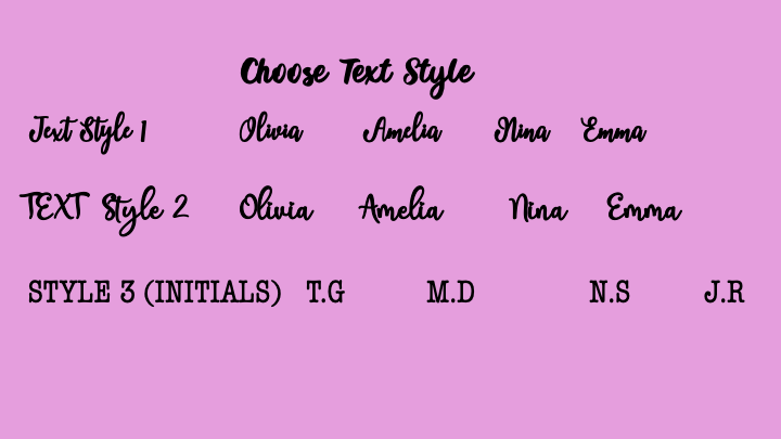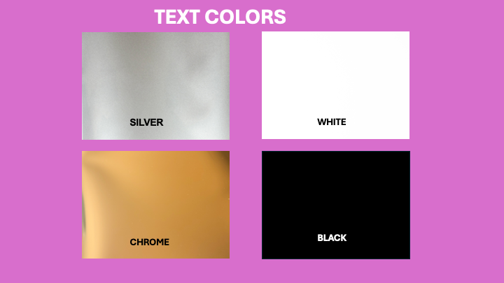 1) Choose between name (Max 10 letters) or initials. 2) Select Font Color- Chrome Gold, Silver, White or Black and 3) Select Font/Text Style